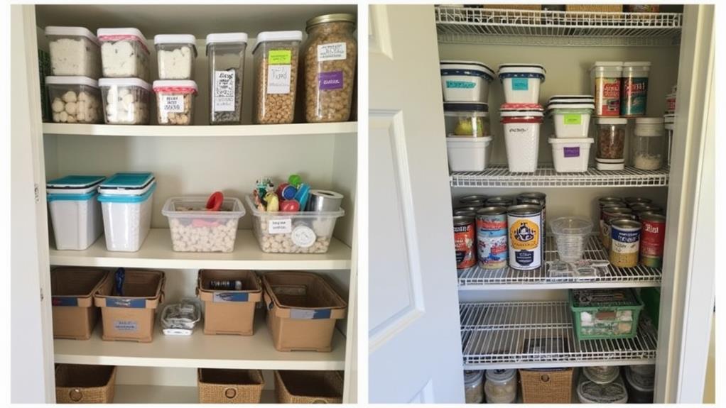 Ready to whip that pantry into shape without emptying your wallet? Start by decluttering and evaluating what you've got. Then, get creative! Repurpose household items like glass jars and shoeboxes for storage. Maximize vertical space with stackable bins and over-the-door organizers. Create budget-friendly solutions by upcycling containers or hitting up dollar stores. Don't forget to label everything clearly – it's a game-changer! Organize by zones to make finding items a breeze, and maintain your hard work with regular inventory checks. Trust me, mama, a tidy pantry makes meal prep so much easier. And who knows? You might even discover some forgotten treasures lurking in those corners!
