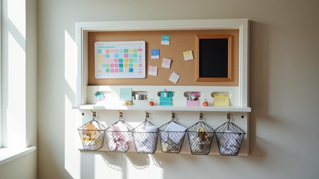 Now that we've maximized vertical space, let's turn our attention to streamlining family communication and organization. Creating a functional family command center is a game-changer for busy moms! You'll save time and keep the house running smoothly with this central hub. Start by designating a wall or corner for a large calendar, to-do list, and labeled bins for important papers. Consider incorporating stackable storage baskets to organize smaller items like pens, sticky notes, and office supplies. These versatile containers can help maintain a tidy appearance while keeping essentials within reach. Make it easy for everyone to stay informed by assigning each family member their own space. From soccer practice to dentist appointments, everything's visible at a glance. And don't forget the kids' bathroom schedule – no more morning chaos! Weekly updates are a must to keep things current. Trust me, once you set up your command center, you'll wonder how you ever managed without it. It's like having a personal assistant right in your home